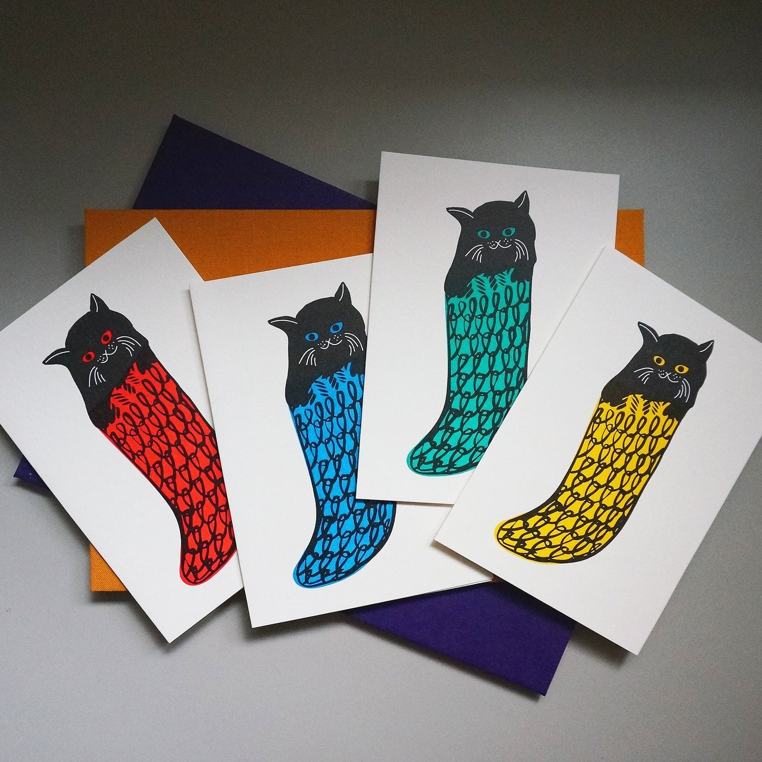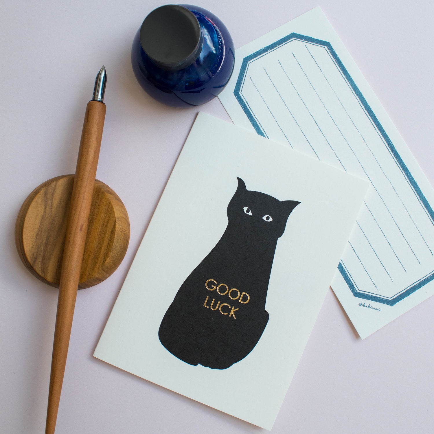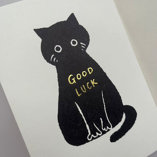 Trifle cat - hand foil block printed greeting card on recycled paper